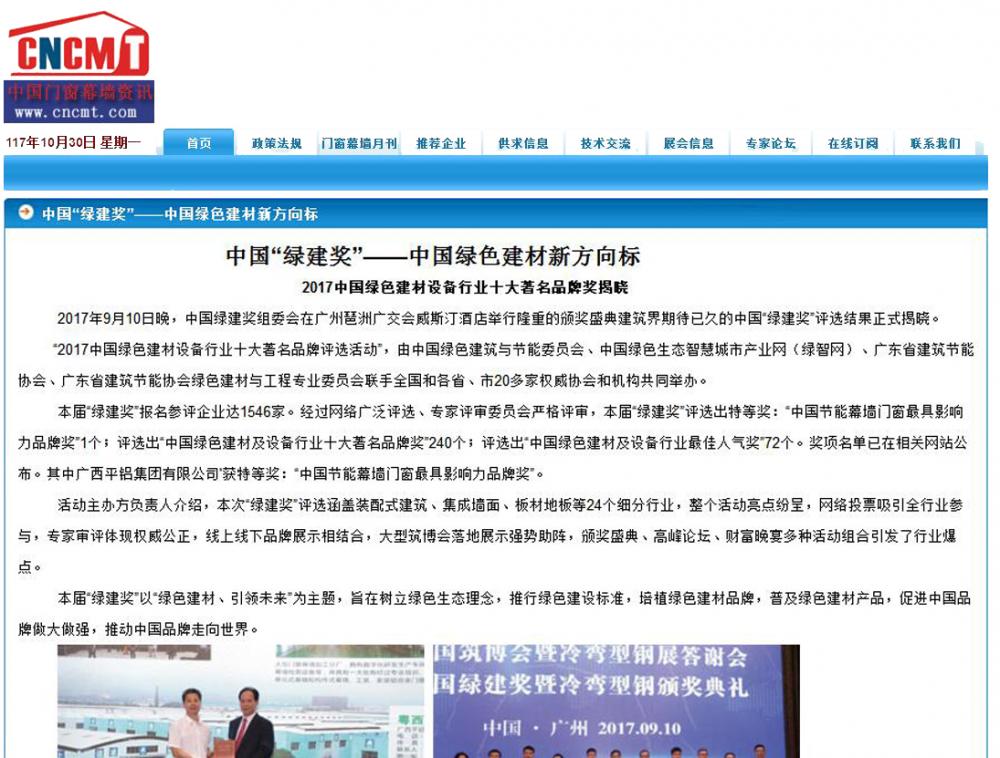 中國建筑工程信息資訊網發布有關2017中國綠色建材設備行業十大著名品牌獎的報道 (2017-10-30)