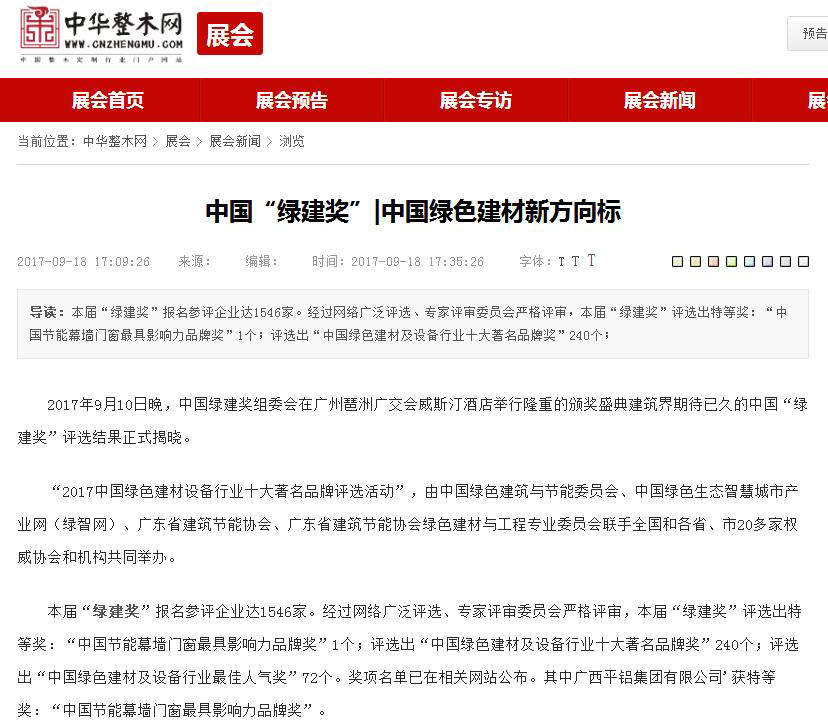 中國門窗幕墻資訊網發布有關2017中國綠色建材設備行業十大著名品牌獎的報道 (2017-10-30)