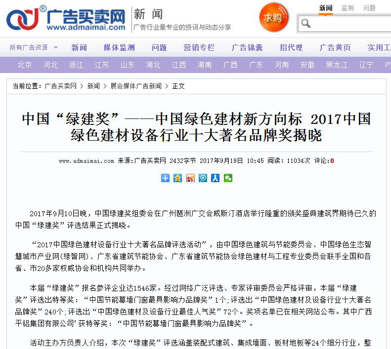 中國門窗幕墻資訊網發布有關2017中國綠色建材設備行業十大著名品牌獎的報道 (2017-10-30)
