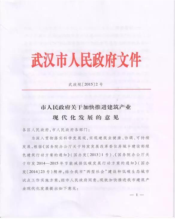 武漢市人民政府印發《市人民政府關于推進建筑產業現代化發展的實施意見》